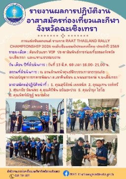 รายละเอียด : อาสาสมัครท่องเที่ยวและกีฬาจังหวัดฉะเชิงเทรา ปฏิบัติหน้าที่อำนวยความสะดวก ต้อนรับแขก VIP ประชาสัมพันธ์การท่องเที่ยว และแจกแบบสอบถาม