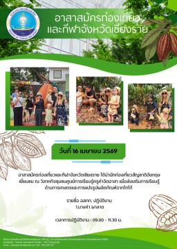 อาสาสมัครท่องเที่ยวและกีฬาจังหวัดเชียงราย ได้นำนักท่องเที่ยวสัญชาติอังกฤษ เยี่ยมชม ณ วิสาหกิจชุมชนศูนย์การเรียนรู้ครูคำจิตอาสา เพื่อส่งเสริมการเรียนรู้ด้านการเกษตรและการแปรรูปผลิตภัณฑ์จากโกโก้